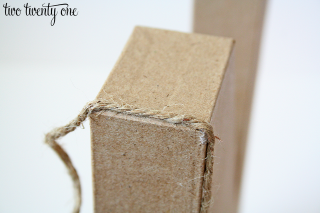 After wrapping one side, I moved on to the other side.Next, I glued pieces of jute on to the four sides of the angled section. I did this so when I wrap it horizontally the jute has something to hold on to.