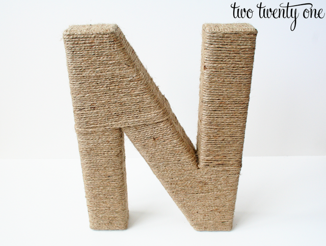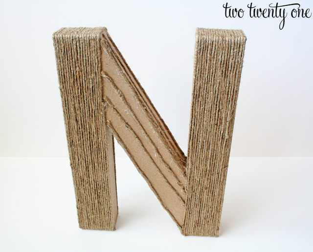 I started by securing the jute on the backside of the letter with my glue gun.Then, I started to vertically wrap it around that section of the N.